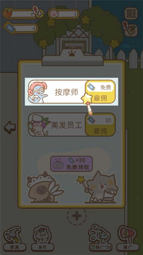 3、招募各种可爱的猫猫来为水疗馆担任员工,提高工作效率。