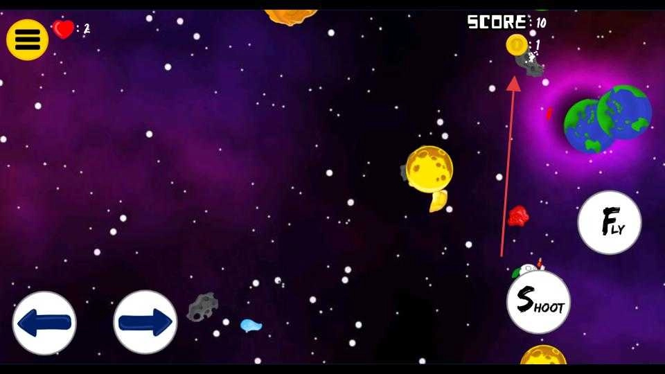 3、在太空冒险过程中点击右侧的Shoot按钮,发射攻击来摧毁星球,同时收集场景中出现的金币,留意分数和爱心的变化,躲避可能的危险。