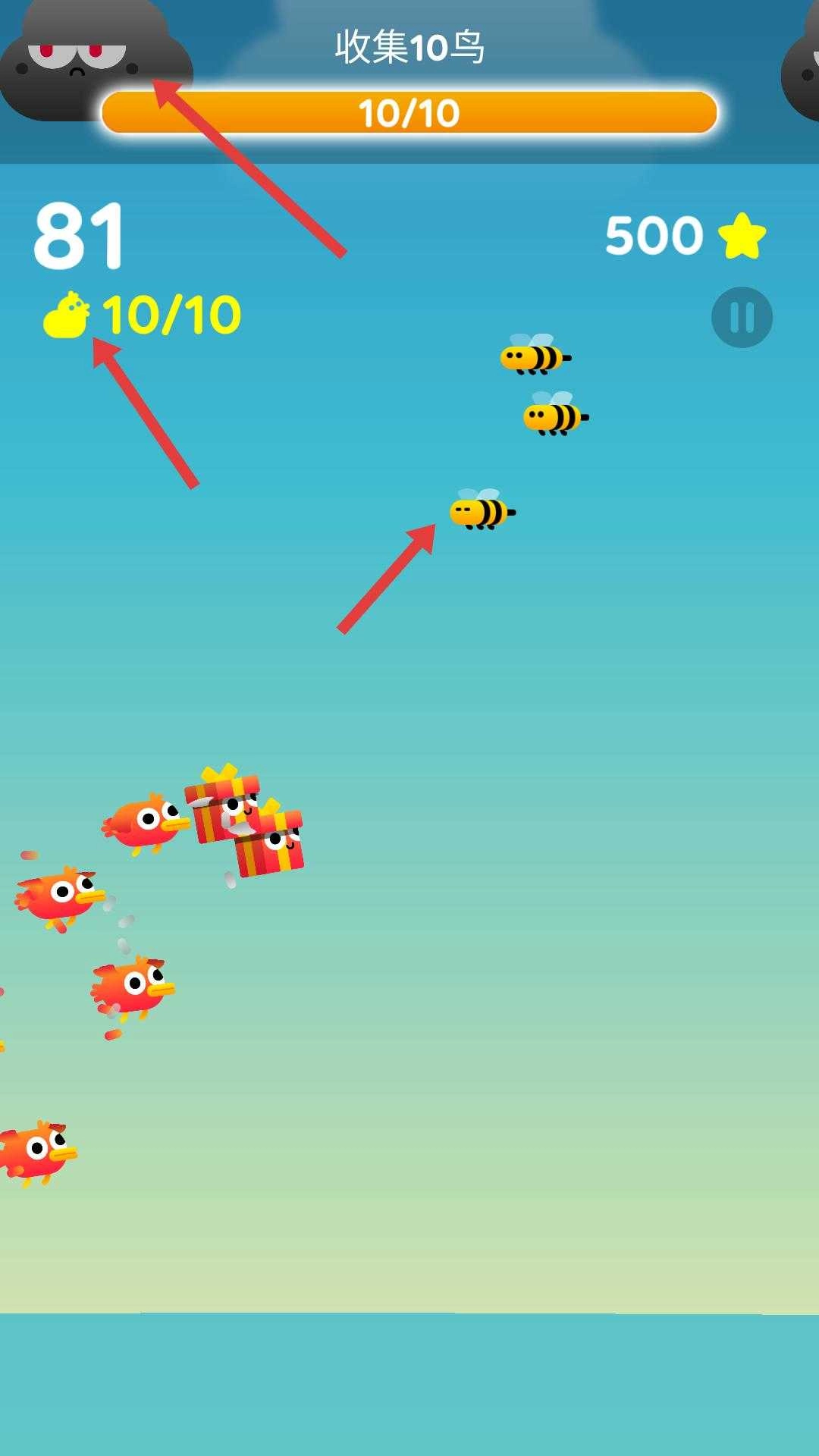 3、继续收集小鸟,当收集进度达到要求会出现新的元素如蜜蜂等,要注意这些新元素,顺利完成收集小鸟的任务。
