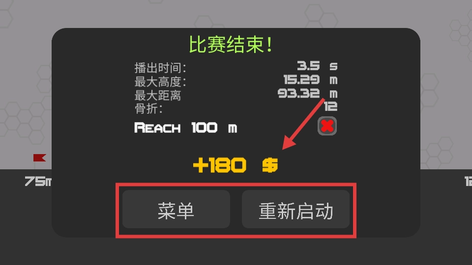 4、比赛结束后,获取金币奖励,可点击“重新启动”或“菜单”可返回主界面。