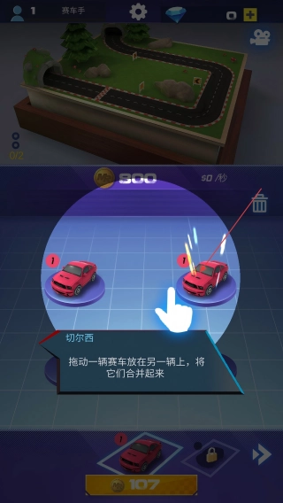 2、拖动一辆粉色赛车到另一辆上,完成合并升级。