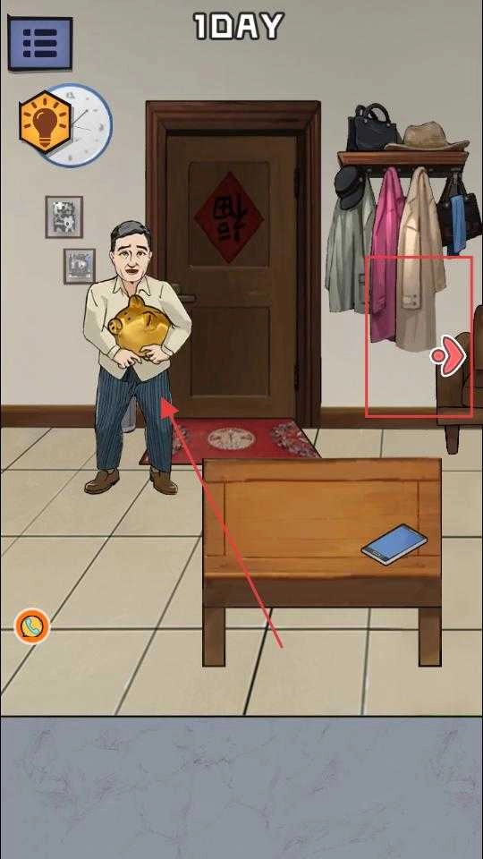 4、完成桌子下方物品的互动后,游戏画面会发生变化,此时点击房间里衣架附近的区域,就能触发后续的游戏情节,让游戏按照设定好的流程继续进行