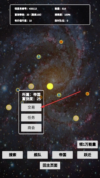 3、点击一颗星球选择【交易】