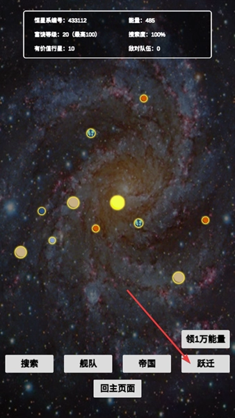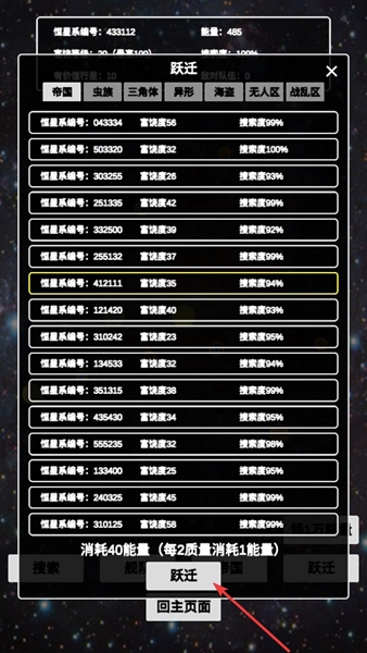 2、选择想要前往的地点后点击【跃迁】按钮消耗能量即可前往目的地