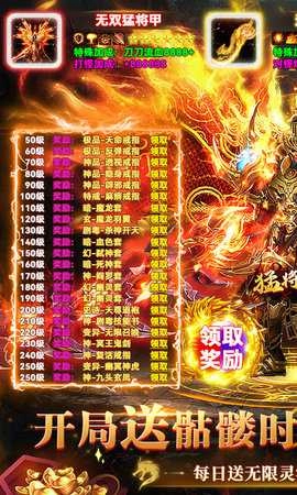 游戏里的爆率相当可观,玩家能轻松获取各类神器装备来增强自身战力。登录就有满攻速加持,一秒5刀的爽快体验直击灵魂。游戏还会定期推出大乱斗、血战魔龙之类的活动,玩家可以在活动里和其他玩家并肩作战或相互竞技,一起挑战强力怪物,抢夺丰厚的奖励。