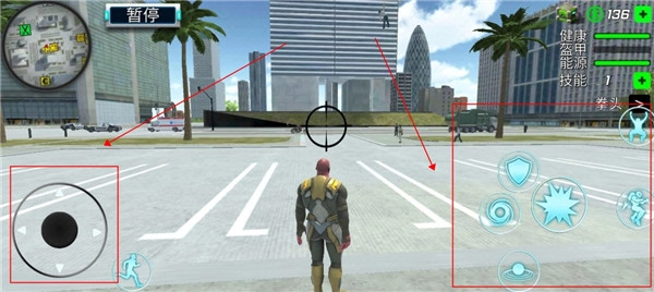 4、然后我们返回游戏界面,左边的摇杆是控制方向的,而右边则是我们的各种技能。