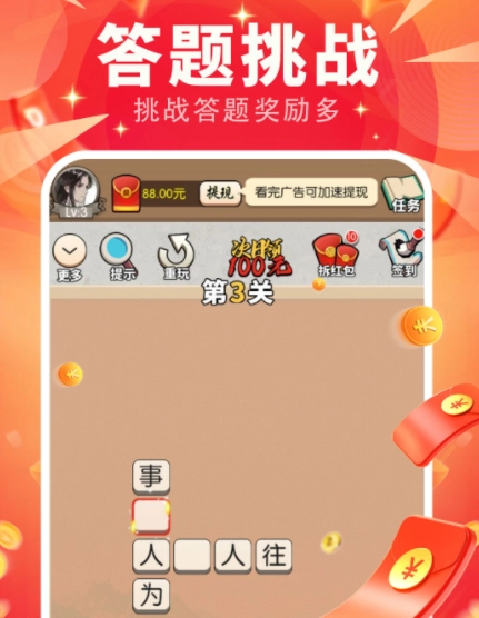 2、在游戏中你可以一边答题一边进行赚钱领红包,累积足够的金额就可以进行提现。