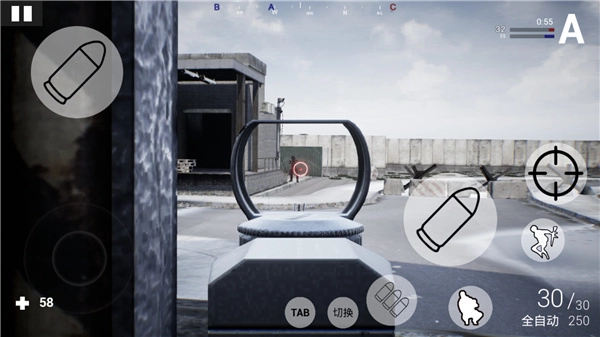 6、当看到前方出现敌人时,点击右侧的瞄准按键,这样能更精准地将敌人击杀。