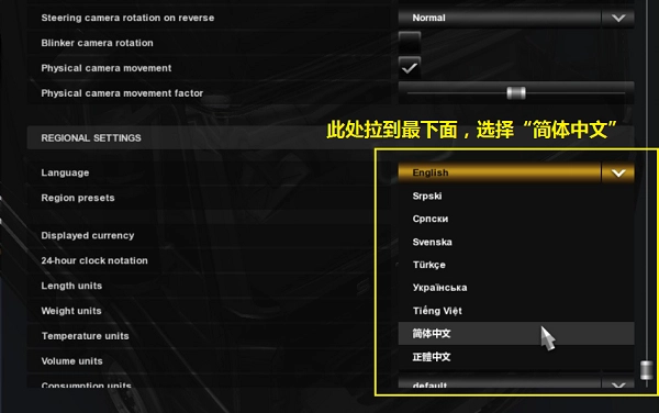 2、然后在语言栏里下拉找到中文,选中就能完成设置。