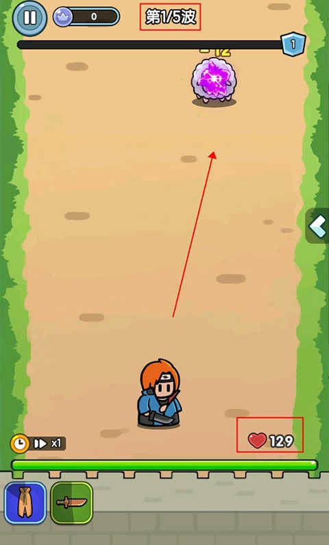 2、开始关卡挑战后,角色会自动攻击敌人,每个关卡都有很多波数,每通过一波就可以重新选择和携带武器。