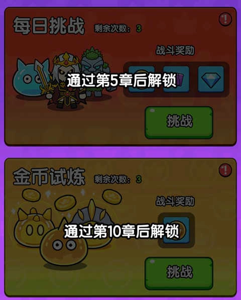 6、此外,游戏内还有每日挑战和金币试炼两大副本关卡可以解锁,玩家分别需要通过第五和第十章才能解锁。