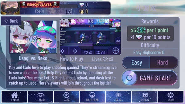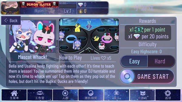 类似经典“打地鼠”玩法,Bella和Usalina会从DJ台两侧的6个孔洞中随机冒出,偶尔还有捣蛋鸭子混入其中!点击正确角色得分,误打鸭子或漏掉目标都将扣去一次机会(共5次)。Easy模式每1分得2倍Bits,20分得1颗Gems;Hard模式虽降为1倍Bits,但同样20分可得1颗Gems,反应要快,眼力要准!