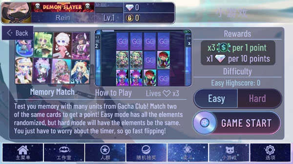 考验观察力与记忆力的时刻到了!从一组隐藏卡牌中找出所有成对匹配的图案。你有3次失败机会,超时即扣除一次生命。Easy模式每得1分获得3倍Bits,10分赢取1颗Gems;Hard模式则升级为4倍Bits,仅需5分即可获得1颗Gems,挑战更高难度,收获更多奖励!