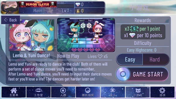 Lemo和Yuni将为你演示一组舞蹈动作,你需要根据提示输入对应的箭头方向(上下左右)。共5次容错机会,一旦出错即扣除一次,机会用完则游戏结束。Easy模式每1分得3倍Bits,10分得1颗Gems;Hard模式每1分得4倍Bits,5分即可兑换1颗Gems,跟着节拍跳起来,赢取丰厚奖励!