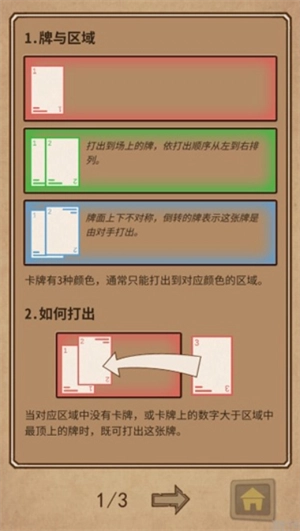 卡牌有三种颜色,通常只能打出到对应颜色的区域。