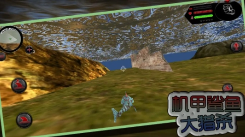 1、通过虚拟摇杆操控机械鲨鱼游动,滑动视角观察周围环境,锁定目标后使用武器组合技发起攻击。