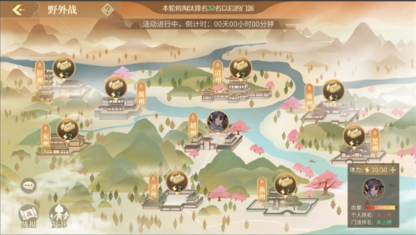 野外战结束后,门派总积分排名前32名的门派,将获得进入据点战的资格。