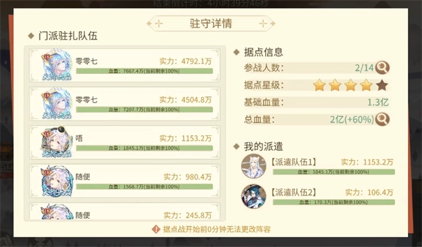 己方门派据点的总耐久血量,等于驻守己方据点的所有队伍的实力之和(另外还会算上银币捐献的加成)。