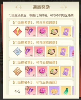 仅参加据点战的32个门派可以参加。根据门派在据点战中的排名,获得不同地区的通商资格。据点战门派排名越高,通商获得的奖励越丰厚。