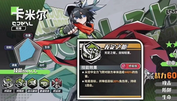 技能方面,大招无定之躯,可以对敌方单体造成400%以上的高倍率伤害,另外,还100%眩晕目标一回合,并降低20%的免伤率,为这回合内后续队友都输出创造条件。另外,他还可以与雷狮进行互相辅助,被动技能觉悟,战斗被动使,角色攻击时额外造成35%真实伤害的同时,倘若队伍中还有雷狮,则可以额外提升15%的伤害率。可以说小卡与雷老大算是,额外角色羁绊增强,组队在一起的话,一个群体大范围输出一个单体爆炸,完美的形成双核队阵容。