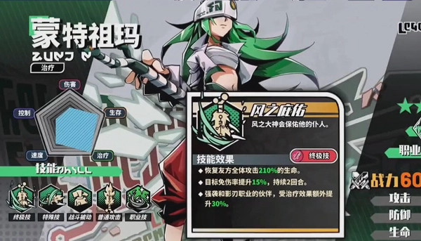 技能方面,大招风之庇护群体回复技能,恢复友方群体单位攻击力百分之210左右的生命值,且所有目标获得15%的免伤,持续两回合。另外,这个技能最绝的是强袭职业和影刃职业的小伙伴伴,治疗效果额外再提升30%。人工回复还加免伤,面对刺客或法师输出值,额外再提升治疗效果,绝对是输出队的关键,相当不错的治疗大招。
