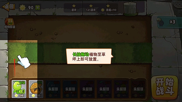 2、在游戏中长按拖动植物至草坪上即可放置