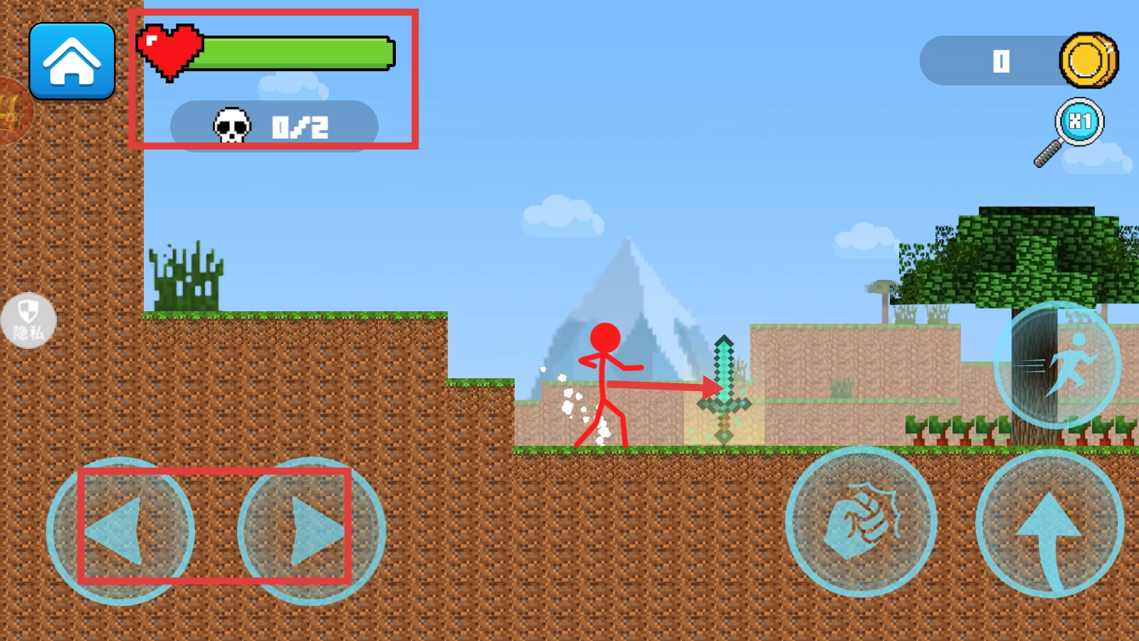 2、操控左侧左右方向键移动角色,关注上方生命值与【0/2】敌人计数,在关卡中灵活走位探索。