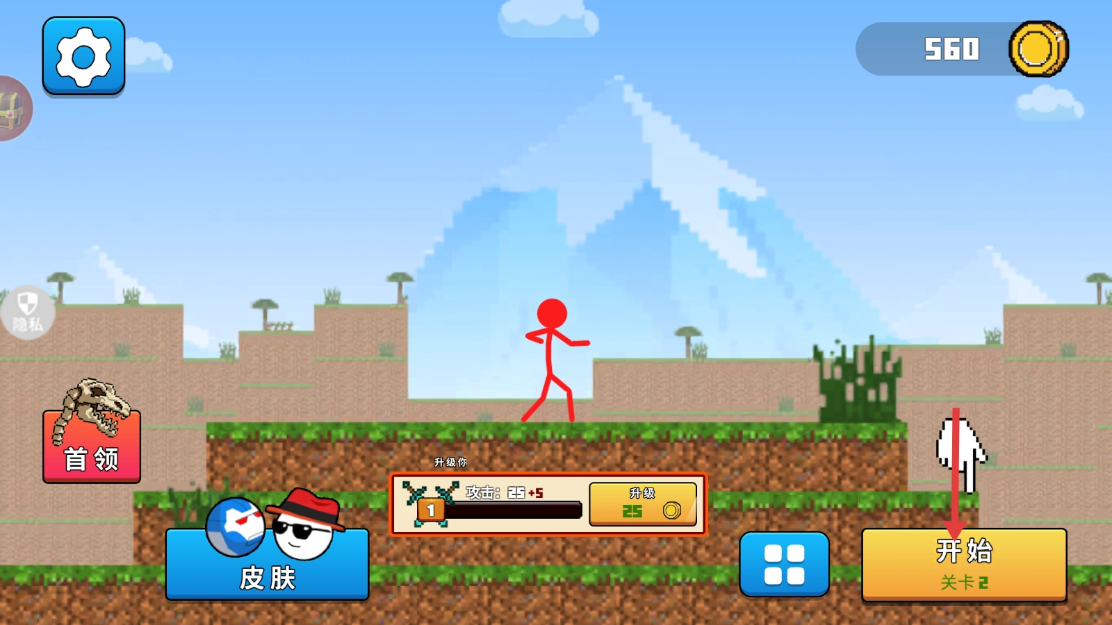 1、点击【开始-关卡2】进入游戏,能花费25金币对【攻击-25+5】进行升级,增强战斗能力后解锁关卡。
