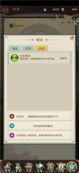 1、进入游戏后,因为是初始段,仙友们需要先修炼,将境界提升到练气五阶,就可以开启自动修炼功能,这期间耗时不过几分钟,快到没朋友。