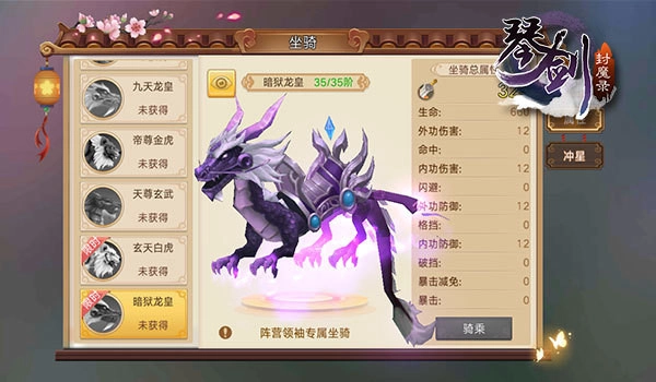 2、各类稀有坐骑既能满足上仙对个性的追求,又能为上仙带来强劲的属性加成。每只坐骑都可通过冲星大幅强化自身属性,以便更好地辅助上仙。冲星需消耗坐骑丹与金币来提升坐骑星级,星级满星后坐骑便会晋升至更高阶级。而满阶坐骑诞生时,还会被赋予独特的流光特效,着实令人敬仰。