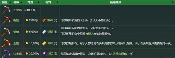 每次工具升级都会减少敲碎石块所需的次数,并允许玩家敲碎更为坚硬和巨大的岩石。
