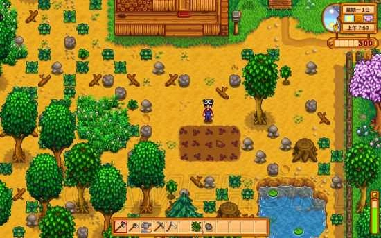 首先,开局都是固定的,出门先把自己的农场清理一下,然后就可以把种子种下了。