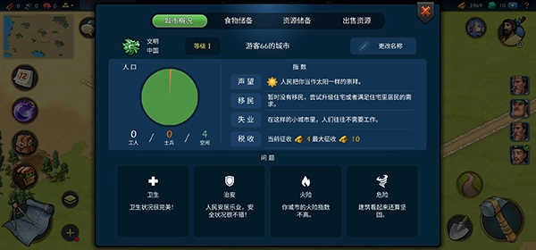 8、点击最左下角的版图,可以查看整个国力如何,城市概况、食物储配、资源储配、出售资源等信息;