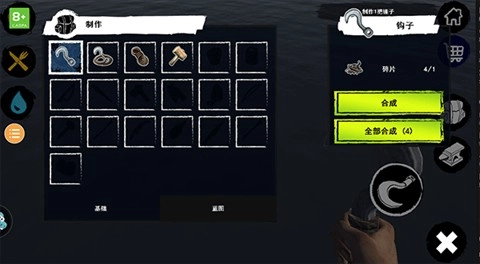 钩子:蓄力扔到远处以钩住材料拉向自己,开局就送一把。合成:3废铁,2绳子