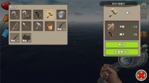 建造锤:用来扩展木筏,造成大船,具体作用后面会详细说明。合成:5木板,2废铁