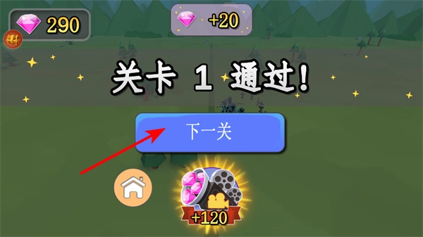 3、关卡1通过后,点击下一关按钮,可进入下一个关卡继续挑战,游戏流程重要操作。