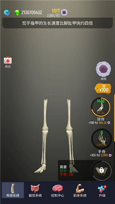 2、从最先的骨架开始解锁,可以先购买100T的细胞开始养成,