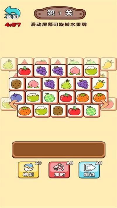 通过把相同的四个水果进行合成消除,等所有水果都消除完就能闯关成功。