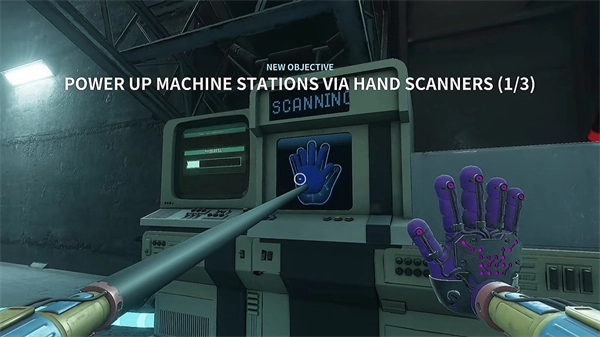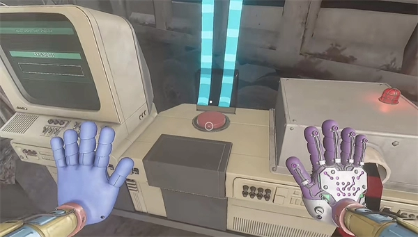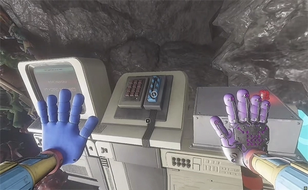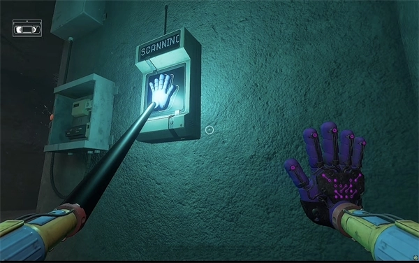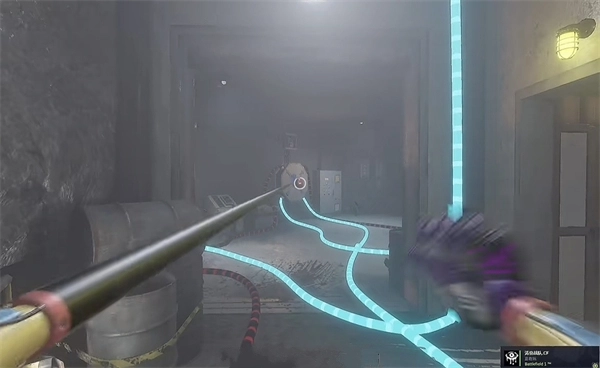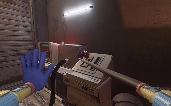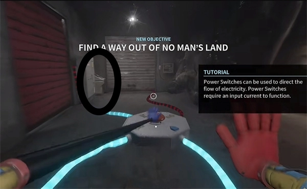 6、打开门进去后,里面还有一个开关需要拉下来,接着往前走,用蓝色手臂去互动前方的开关,这里得触发三个开关才能让电流打通出口。