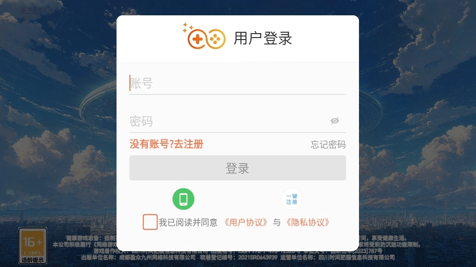 1、在手机上启动环外游戏后,通过输入账号完成登录或注册操作。