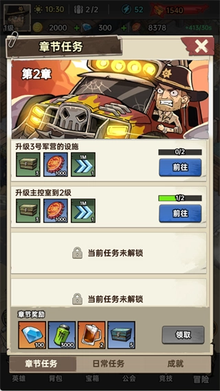 完成章节任务、每日任务等,可领取钻石、资源箱等奖励,推动游戏进程。