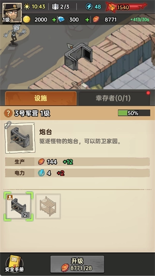 升级炮台、电脑等设施,提升生产与电力产出,增强家园防御与资源供给能力。
