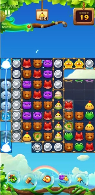 继续找机会创造魔力鸟出现,三个魔力鸟出现,先消二个挨着的魔力鸟。