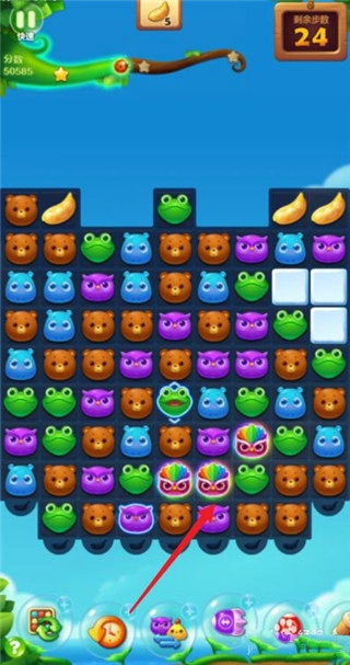 组合四个动物为发光动物头,魔力鸟出现时和发光动物一起爆,即可消灭上方的大量冰块块。