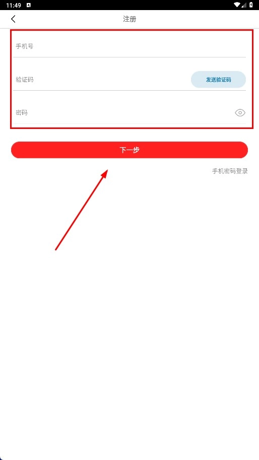 2、若选择手机注册登录,输入手机号、验证码和密码后,点击【下一步-按钮】完成注册流程。