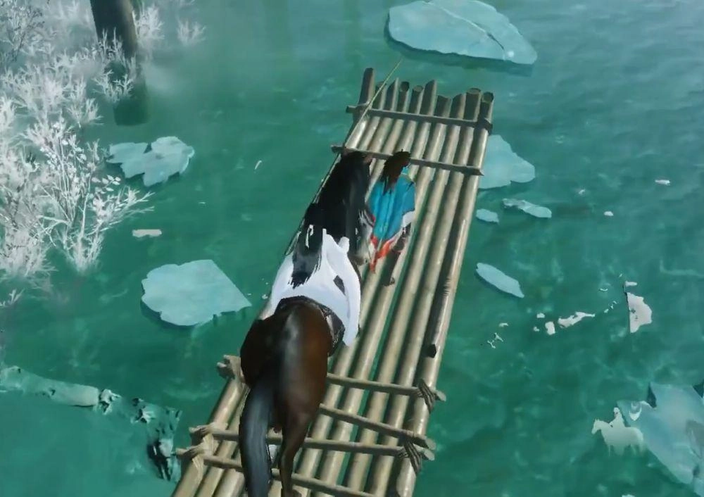 3、最后到达河边之后,这个青衣需要一个人游到湖中间,将竹筏划回来,然后再带上莫璃和马一起上竹筏,然后将竹筏顺着河流往前划。