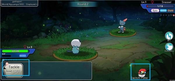 6、进入战斗状态后,点击“tackle”按钮发起攻击,点击“Switchpoke”按钮切换宝可梦。