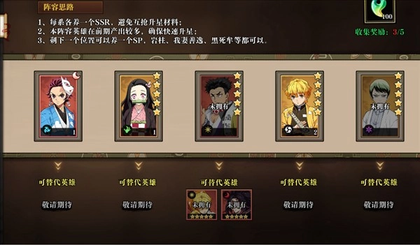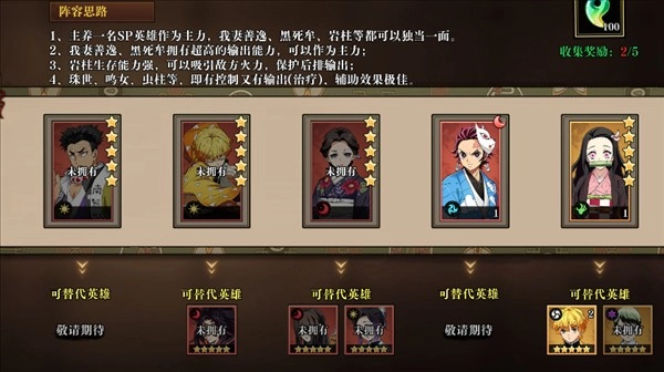 主养一名SP英雄作为主力,我妻善逸、黑死牟、岩柱等都可以独当一面。