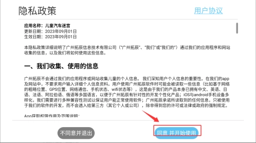 1、打开儿童汽车迷宫应用,阅读并同意隐私政策后,进入应用的主界面。