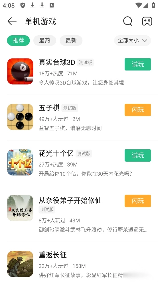 3、选择你自己喜欢的,点击试玩,就会到手机上,好就可以开始游玩了;